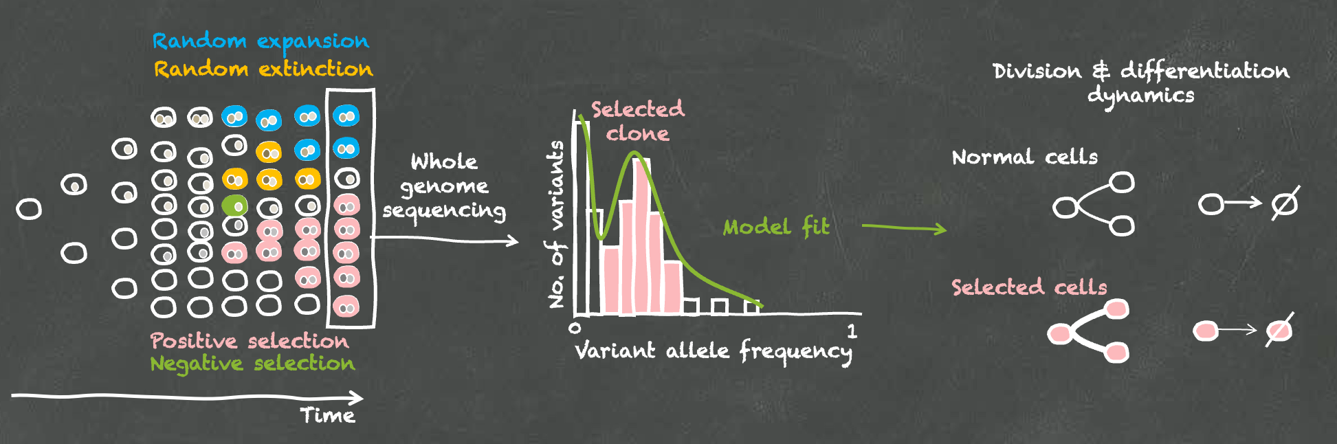 Our research uses the continuous accumulation of somatic variants as molecular barcodes. We combine next generation sequencing at bulk and single cell resolution with the development of novel mathematical models of division and differentiation dynamics along stem and progenitor cell hierarchies. These models use fundamental principles from population genetics to identify characteristic footprints of genetic drift and clonal selection in the cumulative distribution of somatic variant allele frequencies (Figure 1). We use these tools to quantify tissue renewal in the aging human blood (Körber et al., Nature Genetics, 2025), and during the development of leukemia, brain cancer (Körber et al., Cancer Cell, 2019; Okonechnikov, Joshi & Körber et al., Nature, 2025) and neuroblastoma (Körber et al., Nature Genetics, 2023). In a complementary line of research, we generate single-cell multiome data from primary human tissue to generate mechanistic hypotheses on the molecular regulation of division and differentiation decisions in health and disease. We test these hypotheses experimentally in appropriate in vitro and in vivo models. Our research is driven by interdisciplinary teams with expertise in biology, medicine, mathematics, physics and data science.